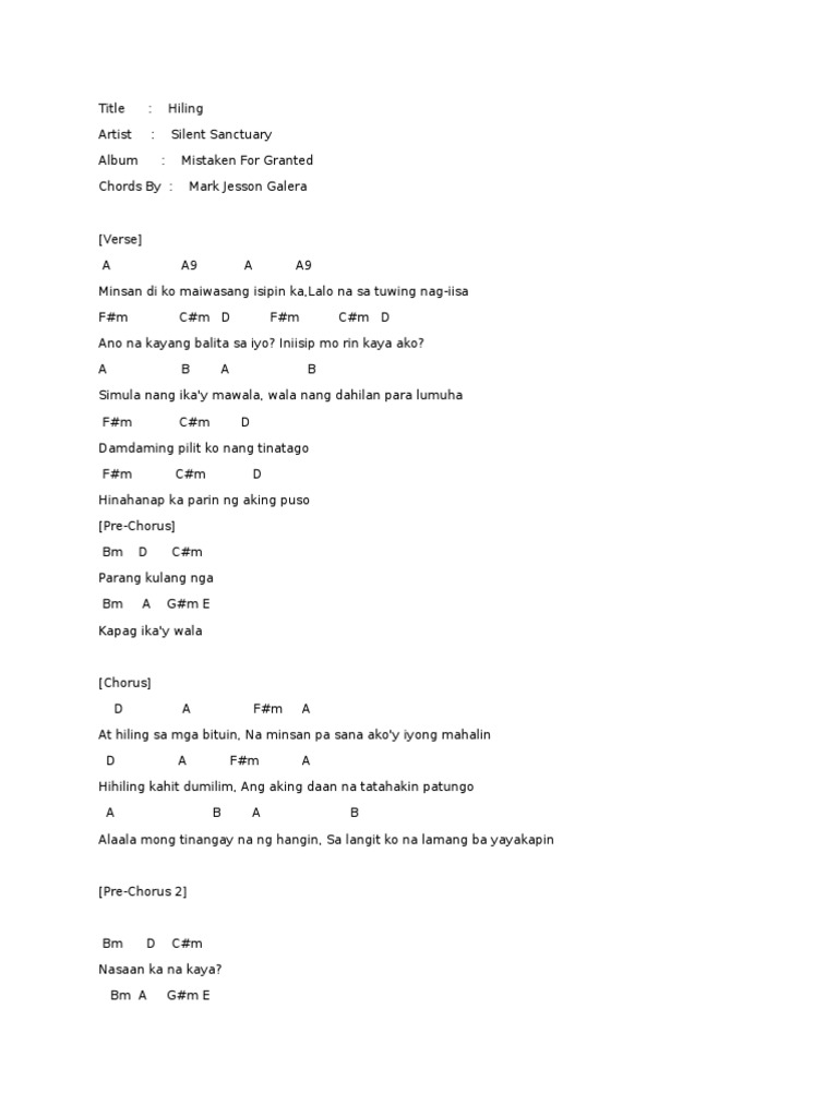 Wala nang dahilan para lumuha. CHORDSLYRICSTABS Hiling Silent Sanctuary A9 Dm9 Minsan di ko maiwasang isipan ka A9 Dm9 Lalo na sa twing nag iisa Fm E D9 Ano na kaya balita sayo Fm E D9 Naiisip mo rin kaya ako A9 Dm9 Simula nang ikaw ay mawala A9 Dm9 Wala nang dahilan para lumuha. Mi A nsan di ko maiwasang Bm isipin ka La A lo na sa tuwing nag-Bm iisa A Fm no na kaya b Cm alita sa i D yo Na Fm iisip mo Cm rin kaya a D ko.