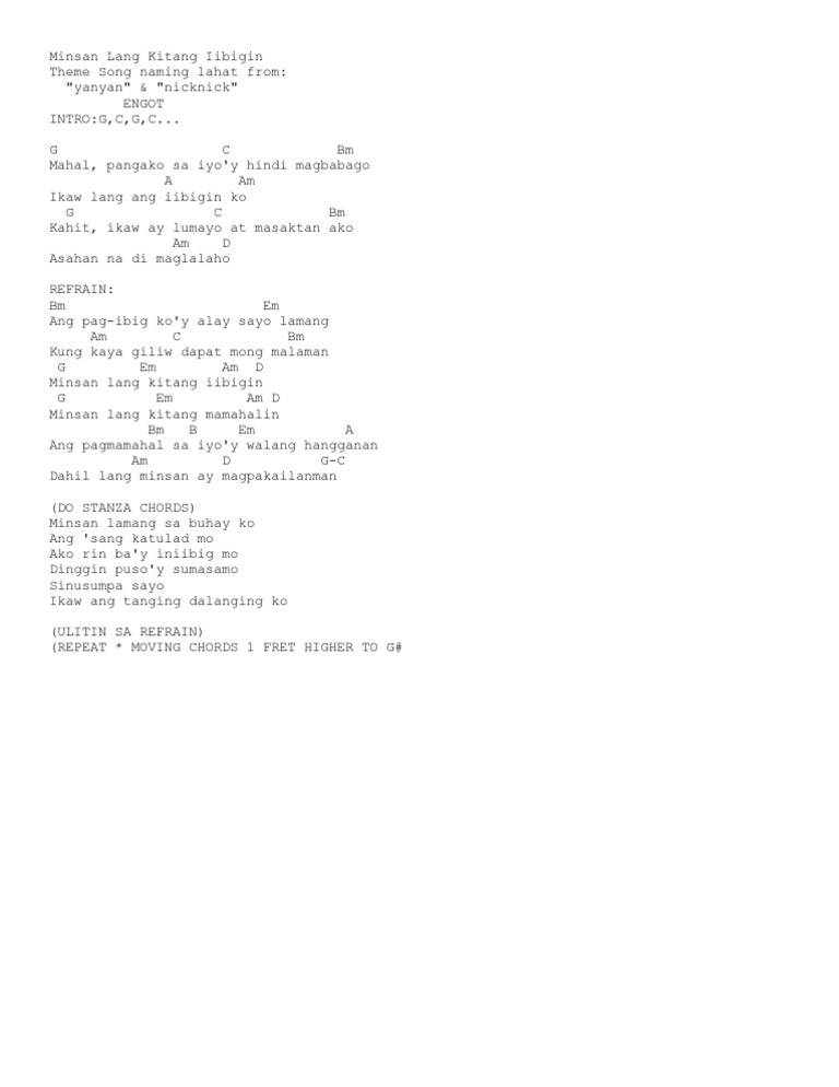 Minsan Lang Kitang Iibigin Ariel Rivera Intro G C G C Verse G C Bm Mahal pangako sa iyoy hindi magbabago Am7 Am kaw lang ang iibigin ko G C Bm Kahit ikaw ay lumayo at masaktan ako Am D Asahan na di maglalaho Refrain Bm Em Ang. Save Save Minsan Lang Kitang Iibigin Piano Sheet For Later. Minsan lang kitang iibigin Minsan lang kitang mamahalin Ang pagmamahal sayoy walang hangganan Dahil ang minsan ay magpakailanman Minsan lamang sa buhay ko Ang sang katulad mo Ako rin bay iniibig mo Dinggin pusoy sumasamo Sinusumpa sayo Ikaw ang tanging dalangin ko Ang pag-ibig koy tanging sayo lamang Kung kaya giliw dapat mong malaman.