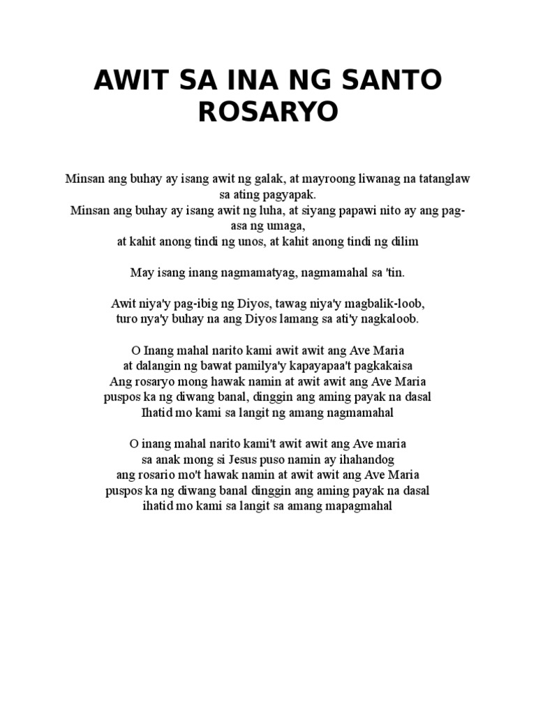 Awit Sa Ina Ng Santo RosarioMinsan ang buhay ay isang awit ng galak. Minsan ang buhay ay isang awit ng galak At mayroong liwanag na tatanglaw sa ting pagyapak Minsan ang buhay ay isang awit ng luha At syang papawi nito ay ang pag-asa ng umaga At kahit anong tindi ng unos at kahit anong tindi ng dilim May isang inang nagmamatiyag nagmamahal sa tin Awit nyay pag-ibig ng Diyos tawag nyay magbalik-loob Turo nyay buhay na ang Diyos. Minsan ang buhay ay isang awit ng luhaAt syang papawi nito ay ang pag-asa ng umagaAt kahit anong tindi ng unosAt kahit anong tindi ng dilimMay isang Inang.